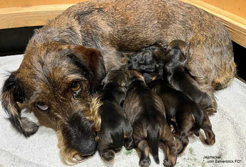 Kleines Update: aus 4 mach 5 .... Eine Hündin ist am späten Abend noch nachgekommen und somit liegen nun 5 gesunde Welpen in der Wurfkiste :-)