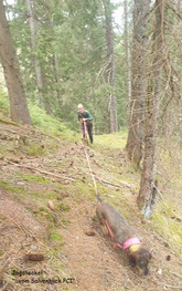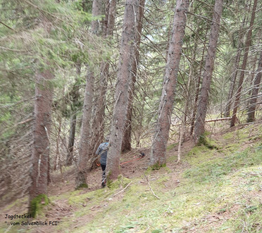 Zwei Übernachtfährten mit jeweils ca. 900m, Rotwildschweiß im Hochgebirgsrevier. Rehwild, Rotwild und auch Gamswild sind Standwild und waren auch deutlich zu spüren. Alle drei Wildarten haben definitiv beide Fährten überquert, Verleitungen waren also zu Genüge gegeben. Für beide Dackel war es nach fast 7 Monaten und wirklich vielen Stöberjagden wieder die erste Schweißübungsfährte; man hat es auch deutlich gemerkt.... Warum so lange gewartet? - der Schnee.